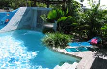 under the shady palms in the award winning pool, splash under the 2m waterfall, wallow in the spa sipping exotic cocktails while watching the outside world on the home entertainment system within the pool pavilion. |